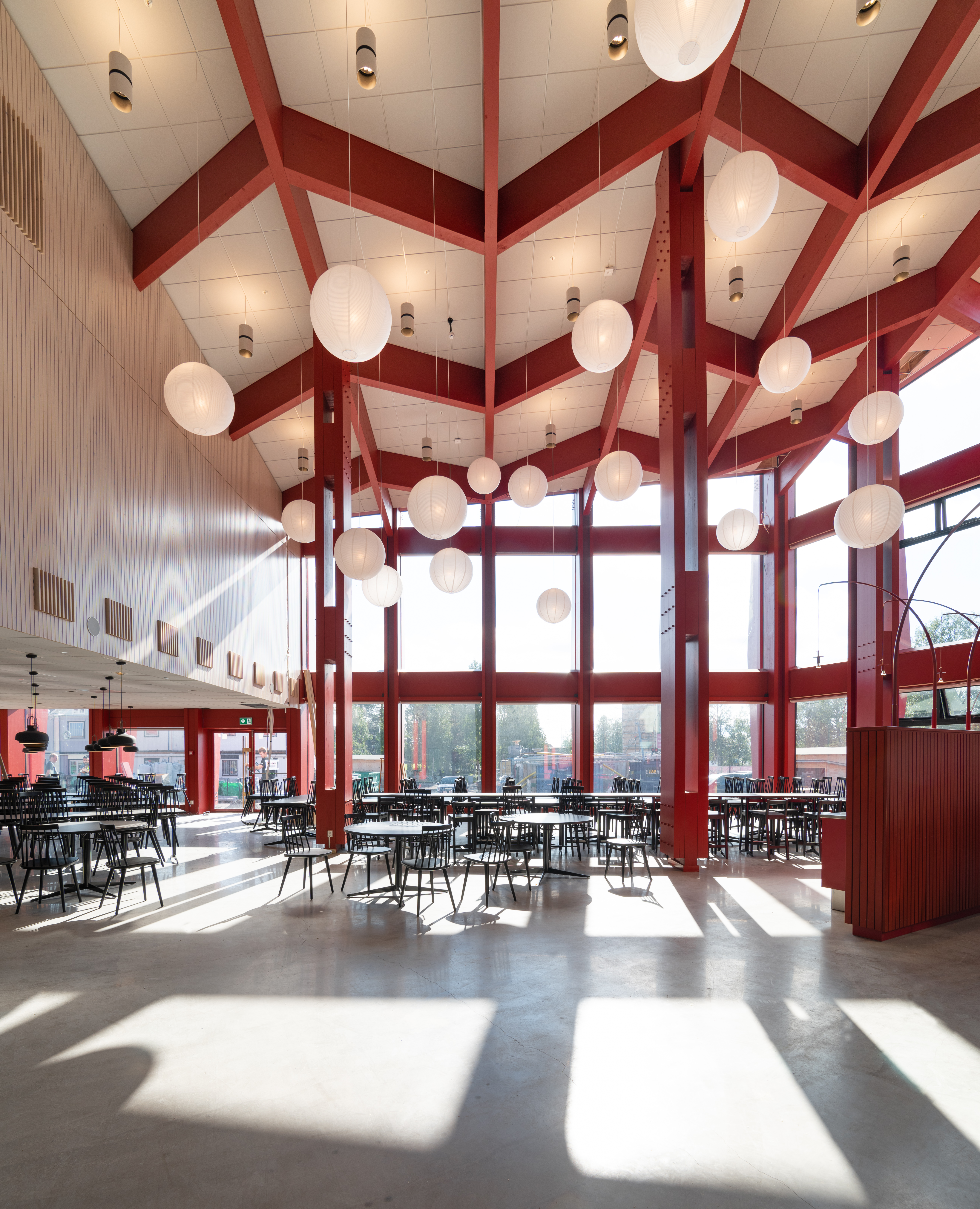 Skolans rymliga matsal har en fiskbensmönstrad takstruktur som fungerar som ett konstnärligt smycke. Mönstret är tänkt att beskriva platsen och kulturen, och samtidigt ge byggnaden en personlighet. Foto: Anders Bobert