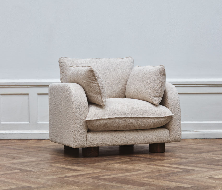 Hela kollektionen som är handgjord i massivt trä och plywood kommer med fyllning av kallskum och dunsvepning. Tygerna som visas är från spanska James Malone och kommer i zebra samt bouclé.