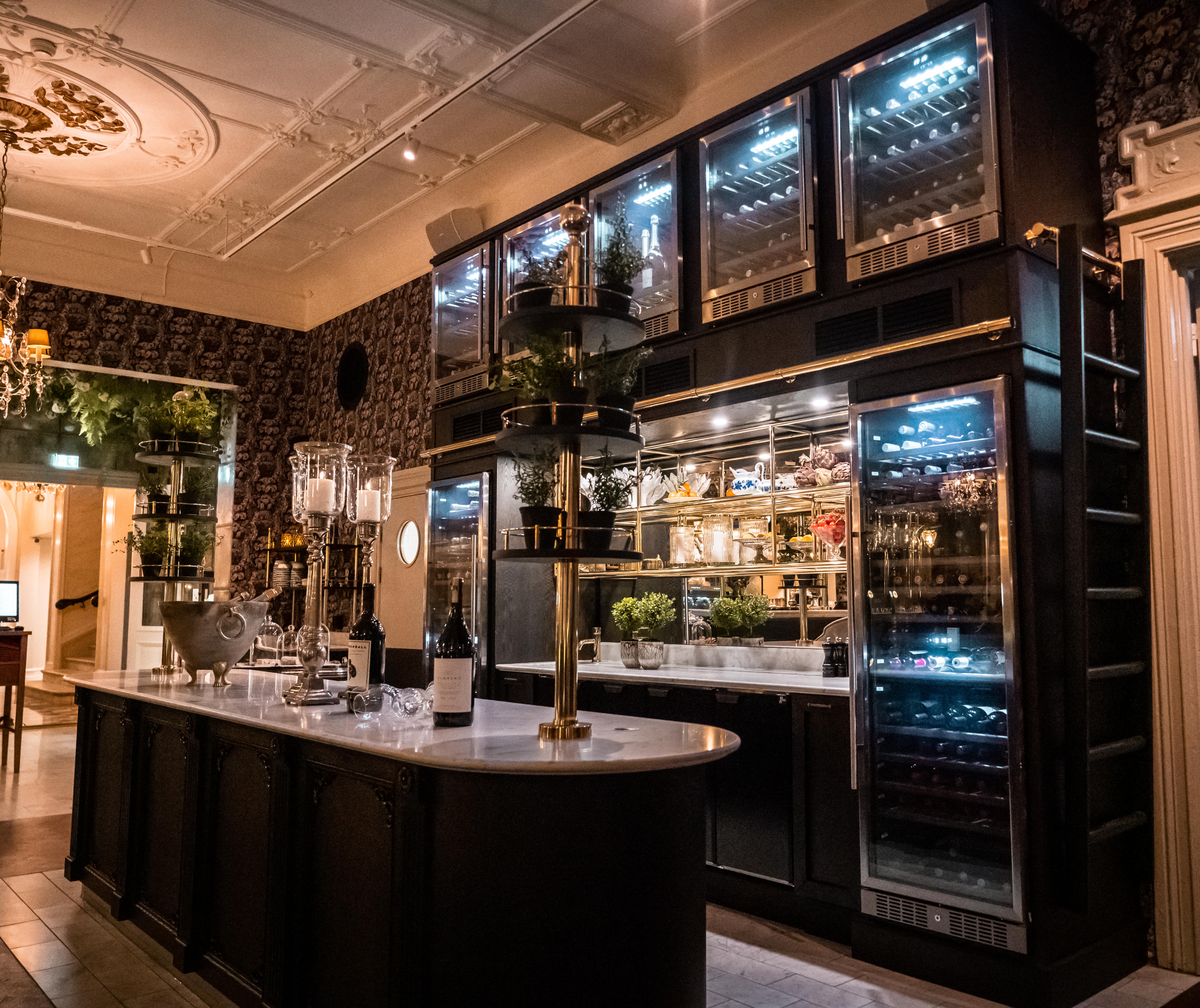 –I matsalen finner vi Vinoteket med inbyggda kylar för olika temperaturer och en fristående buffébänk med marmorskiva och underlimmad kylplatta. Vinoteket fungerar på morgonen som en del av hotellets frukostbuffé samt kvällstid för vinprovningar och temakvällar då även kockar och kallskänkor ges möjlighet att arbeta ute i matsalen, säger Lars-Göran Forsberg.