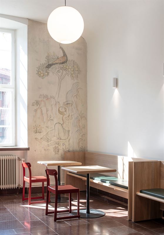Färgsättning och materialval är gjorda med absolut gehör, i samklang med byggnadens vårdprogram. Baskulörer som lugnar kompletteras med djupröda trästolar som representerar studenten, livet och rörelsen. Ny belysning har flätats in i byggnaden och skapar en behaglig atmosfär.