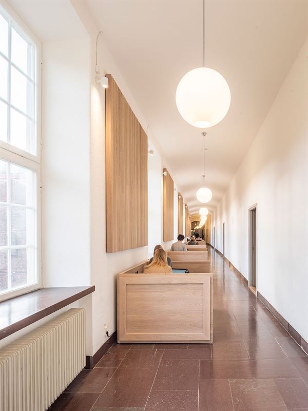 Nu är de öppna ytorna med olika studieplatser fyllda av studenter och en koncentrerad stämning råder. Eleganta men robusta lösningar möjliggör aktivt lärande och olika samarbetsformer. Interiörernas gestaltning, tydlig men följsam, framhäver den ursprungliga byggnaden, kompletterar senare tillägg samt skapar en lugn och självsäker helhet.