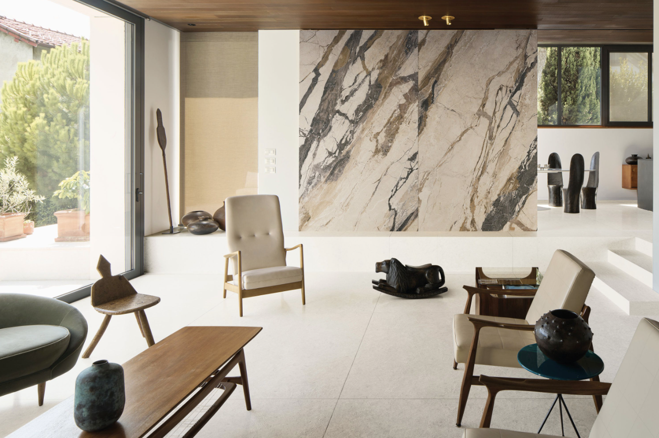 Sapienstone visar materians detaljer genom ytor inspirerade av marmor. Bland nyheterna finns Fior di Viola 4D, den mångsidiga Arabescato 4D, Taj Mahal och de klassiska Calacatta-släkten med nya uttryck. På 4D-keramikskivorna, en teknik från Iris Ceramica Group, löper ådringarna genom hela materialets tjocklek och skapar djup och visuell kontinuitet som framhäver marmorns tredimensionalitet. Ytorna får ett levande uttryck: linjerna rör sig i rummet och skapar visuella vägar som berikar interiören utan extra inslag.