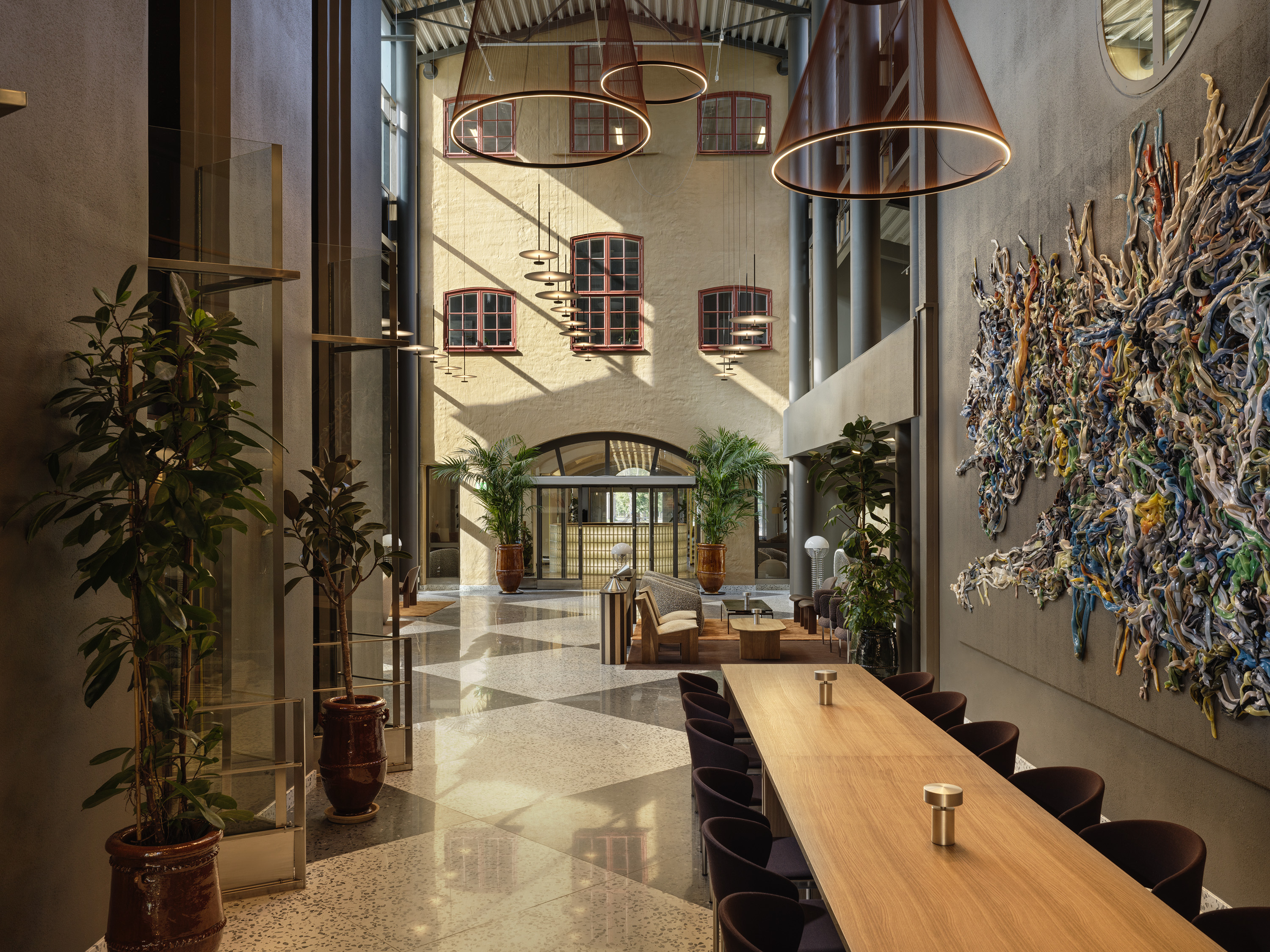 Det stora entréplanet har grafiska rutgolv i svart och vitt, betong, stålkonstruktioner och grå väggar kontrasteras av trämöbler, läder och textilier i chokladbrunt och varma toner. Ett designelement som drar blickarna till sig är den terrakottafärgade trappan i  plåt som förbinder våningsplanen. Restaurangen intill har omslutande väggar i djup kulör och ett tak som veckar sig som en solfjäder. Möblerna går i ek och mossgrönt – en färgskala som för tankarna till landskapet utanför.