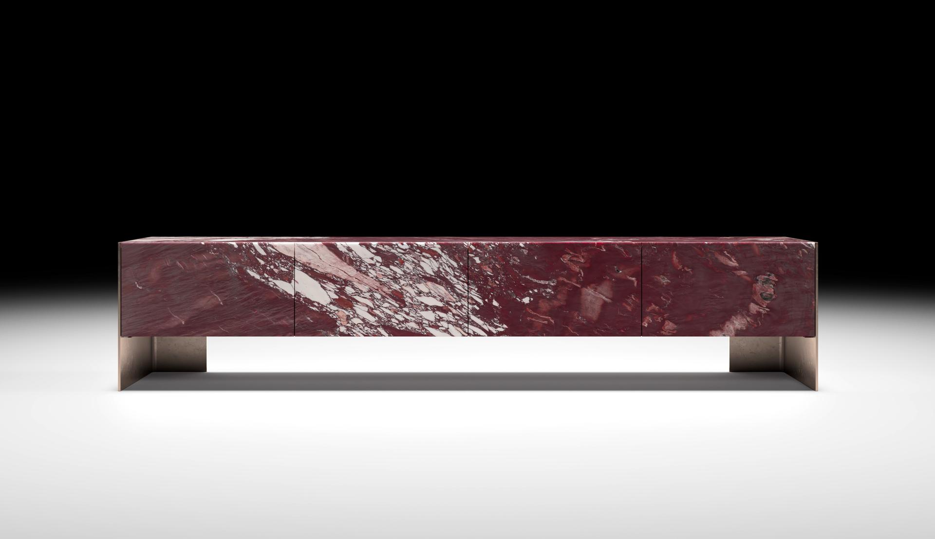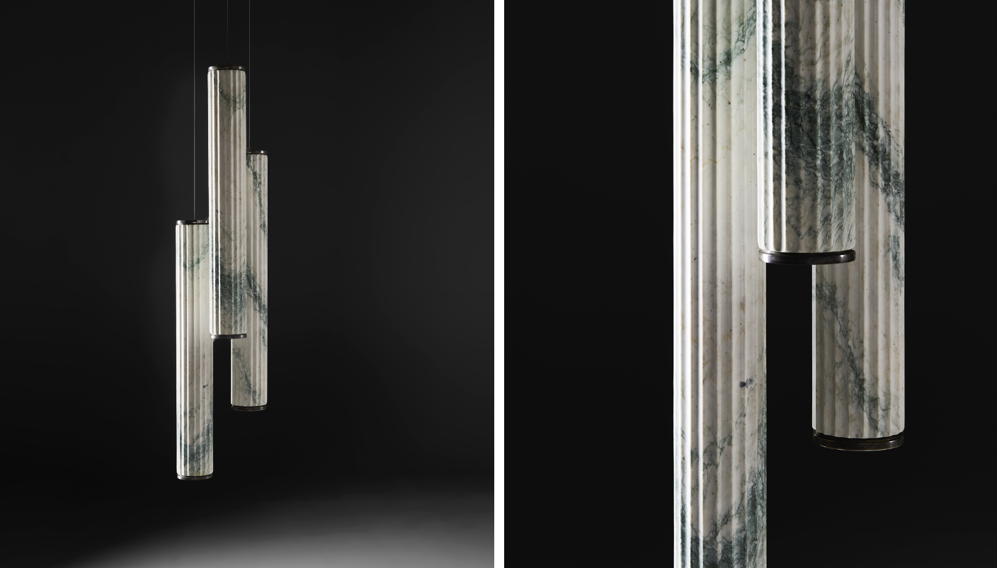 Onis är en kombination av lätthet och stabilitet där balans och styrka möts, inspirerad av hängbroar. Varje enhet hänger som en arkitektonisk fragment och förenar marmor med metall. Den utstickande L-formade räfflan framhäver detaljen och kopplar till vardagens enkelhet. Metallens ytbehandling förstärker stenens uttryck. Inuti skåpet finns lådor med läder- och metallfinish, avsedda för diskret förvaring.