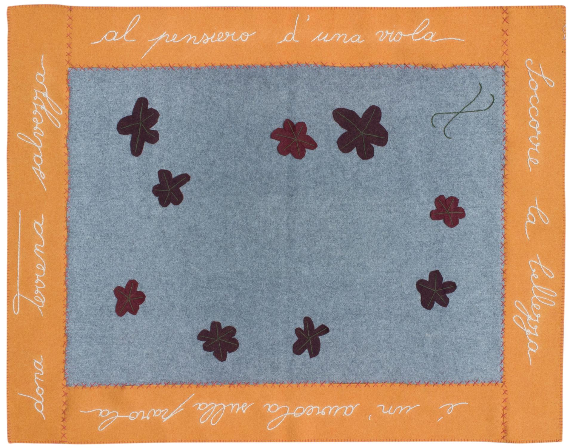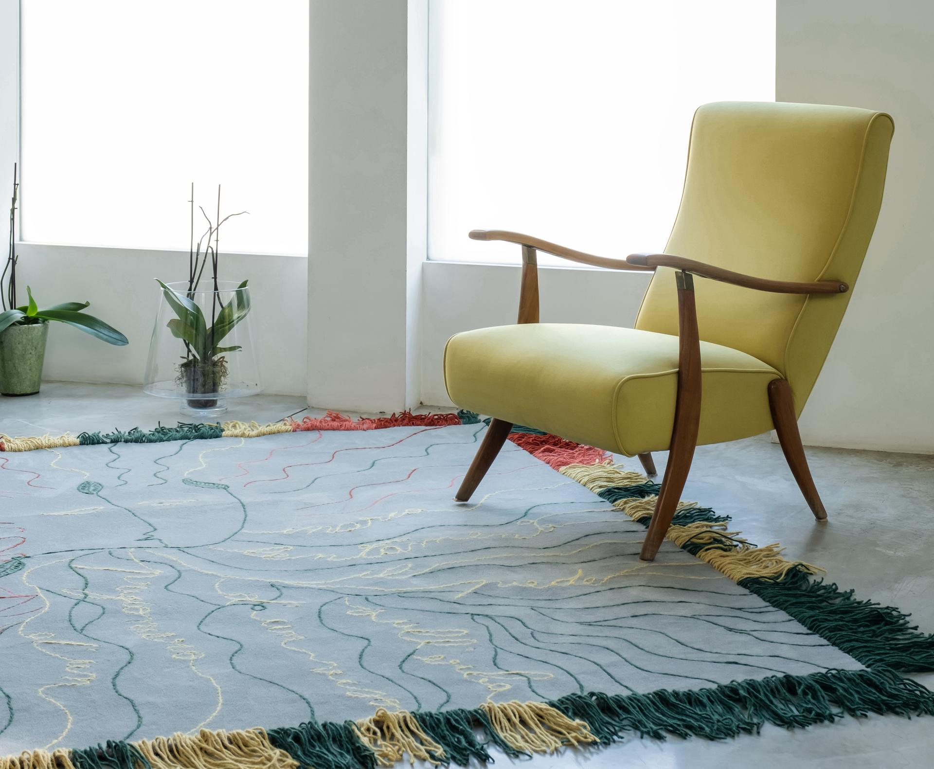 Från kollektionen Linea Contemporanea. En unik matta där poesi och hantverk möts. Tillverkad av filt av alplammull, och hyllar mötet mellan ord och blommor som flätas samman i en visuell och taktil berättelse. Varje detalj är resultatet av noggrant handarbete, vilket förvandlar mattan till ett konstverk.