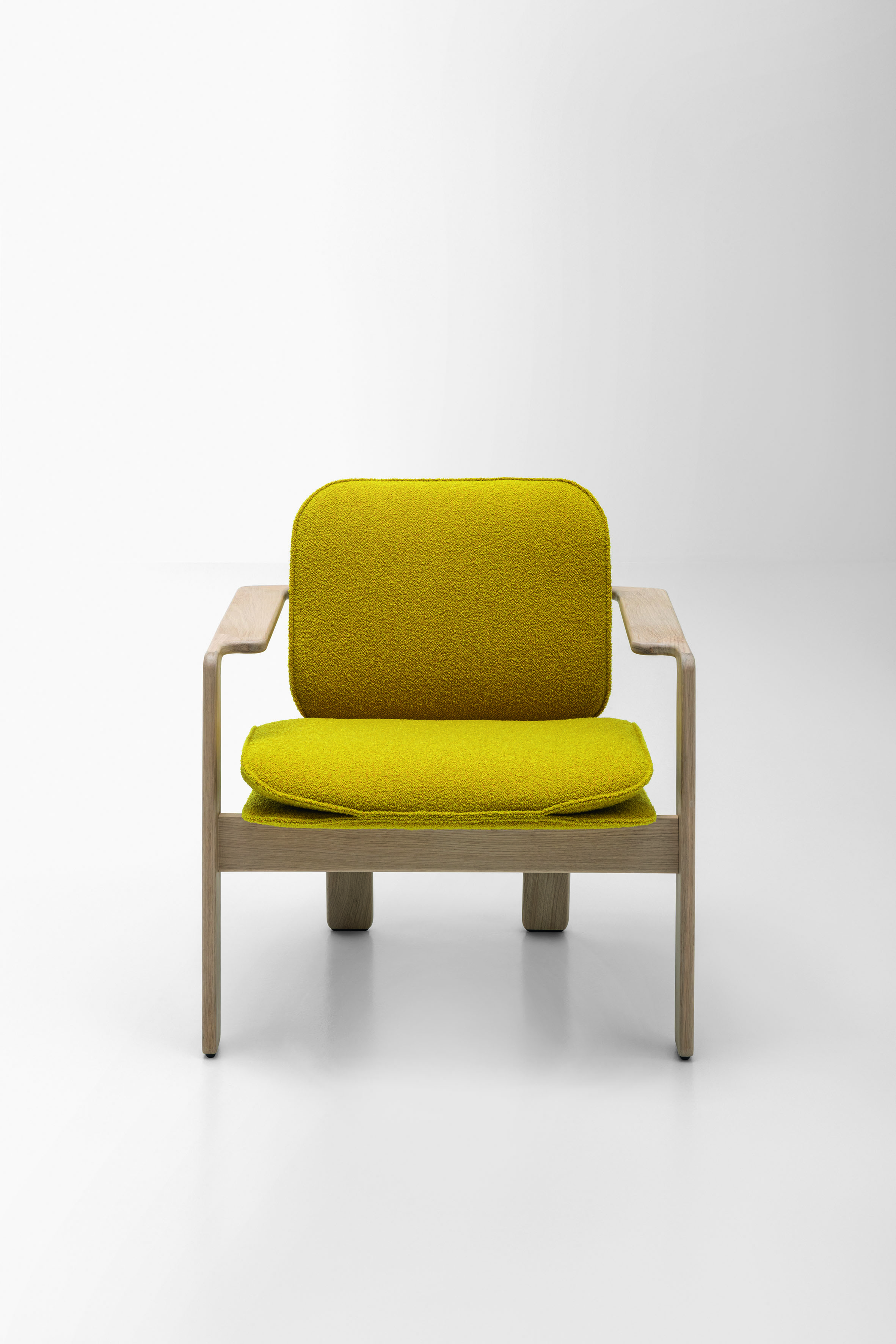 Loungefåtölj med stomme och fogar i betsad ek, plast och filtdistanser. Stödpaneler för sits och rygg i flerskikts trä med avtagbar tygklädsel. Sitt- och ryggkuddar är fastsatta på stommen. Fyllning i tryckbeständig expanderad polyuretan med fast skumöverdrag i polyester.